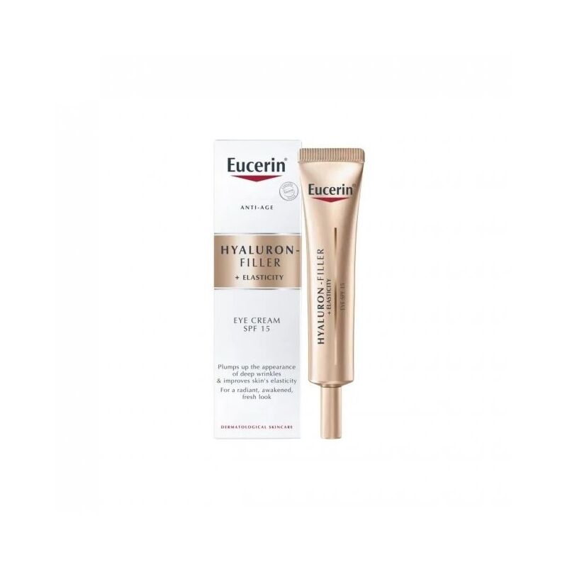 Eucerin Hyaluron-Filler + Elasticity Eye SPF 15 is an anti-aging eye cream that plumps up deep wrinkles and improves skin’s elasticity.