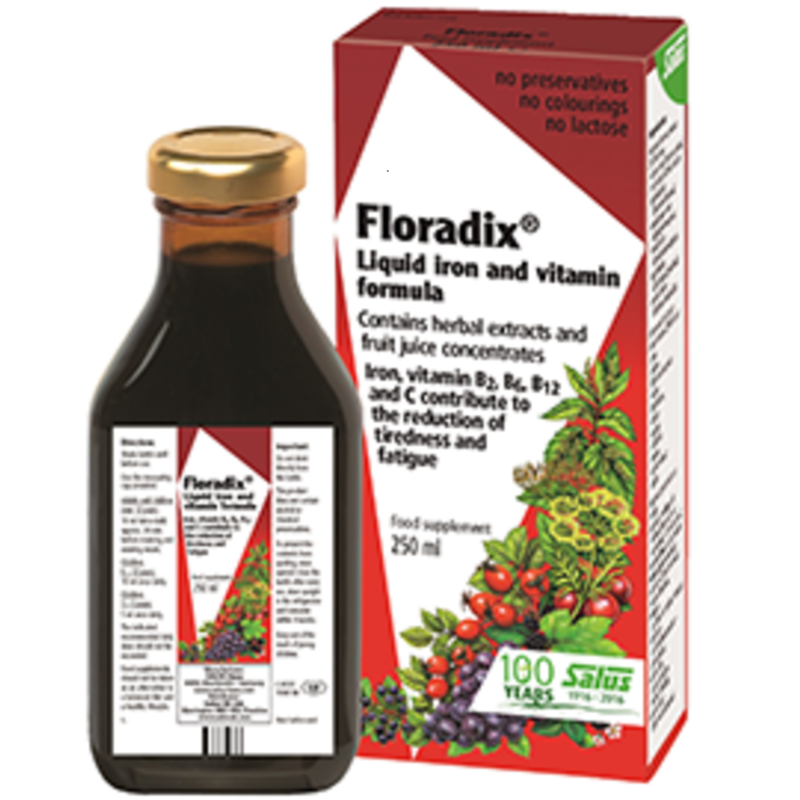 Floradix contains iron (in the form of iron gluconate), vitamins B2, B6, B12 and C which contribute to the reduction of tiredness and to normal energy yielding metabolism. Iron also contributes to normal red blood cell and haemoglobin formation which is supported by vitamins B6 and B12.